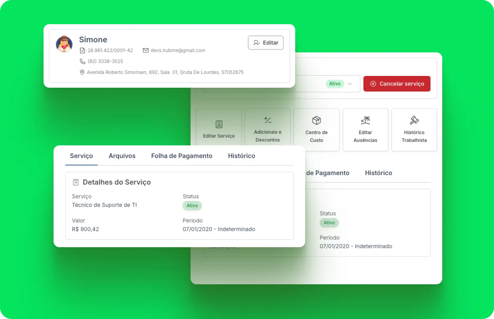 Cadastro, contratos e documentos, horas, remuneração, benefícios, férias/ausências e aprovações de gestor. Tudo num fluxo só, sem planilha, e-mail e WhatsApp
