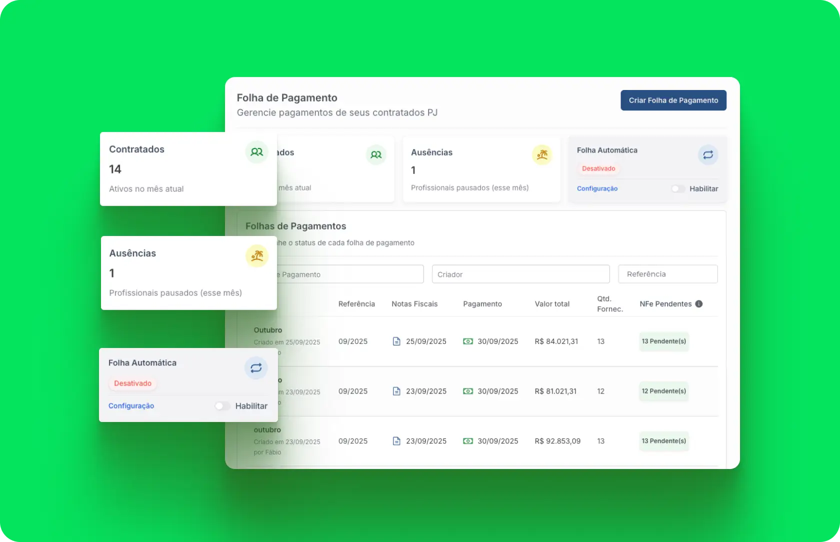 Tudo em um só sistema, do cadastro ao pagamento: Folha PJ, aprovações de gestor, sigilo de valores e histórico rastreável