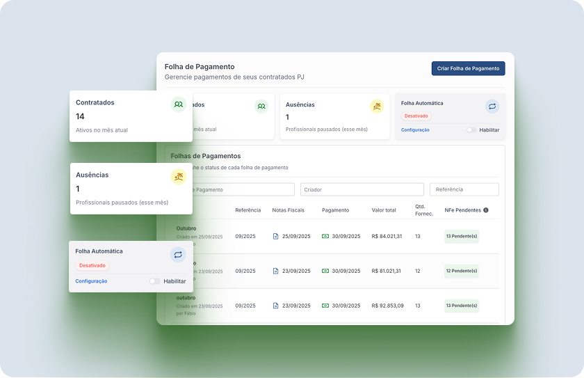 Ao final do cadastro você já estará apto a usar o sistema, realizar o cadastro dos PJs e processos de folha de pagamentos. 30 dias para testar até contratar.