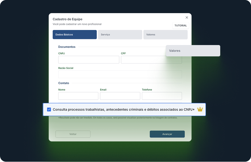 Cadastro inteligente com validação automática, importação em massa da sua base atual e background check integrado no primeiro dia.