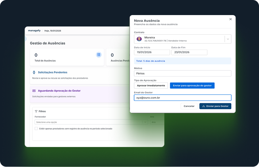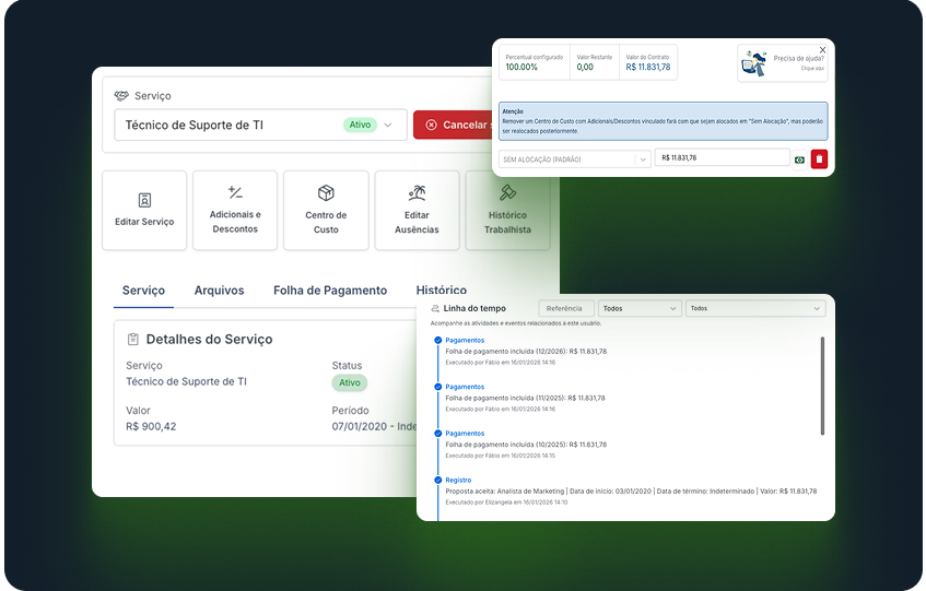 Reajustes, férias PJ, adicionais e comissões, folha, controle de nota fiscal com histórico. Aprovação de gestor antes de liberar qualquer pagamento.