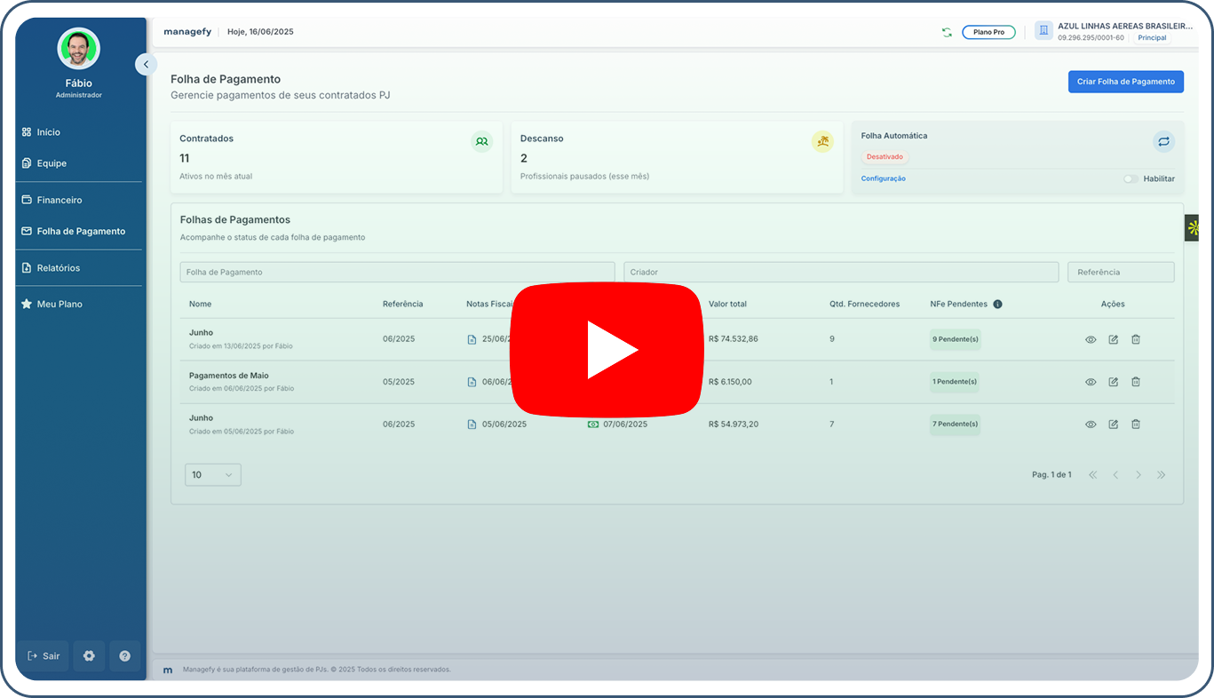 Cadastre PJs, convide o time e ative pagamentos. No primeiro fechamento você já elimina planilhas e retrabalho manual.